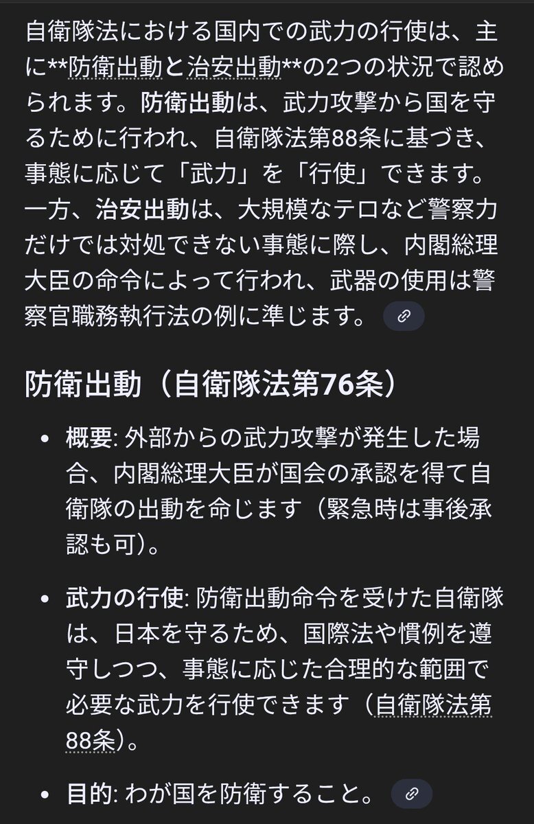 返信先:@nonishin98762撃つじゃなくてあくまで打つ?自衛隊が日本の熊やゴジラに武力による威嚇または行使をしてよいかどうかを、制限しているとしたら自衛隊法、警察官職務執行法によるものであって憲法9条ではありません。なので、ちがいます。最近はAIもすぐわかりやすくまとめてくれて便利だよ。調べてみてね。 pic.x.com/KYCin54ZWU