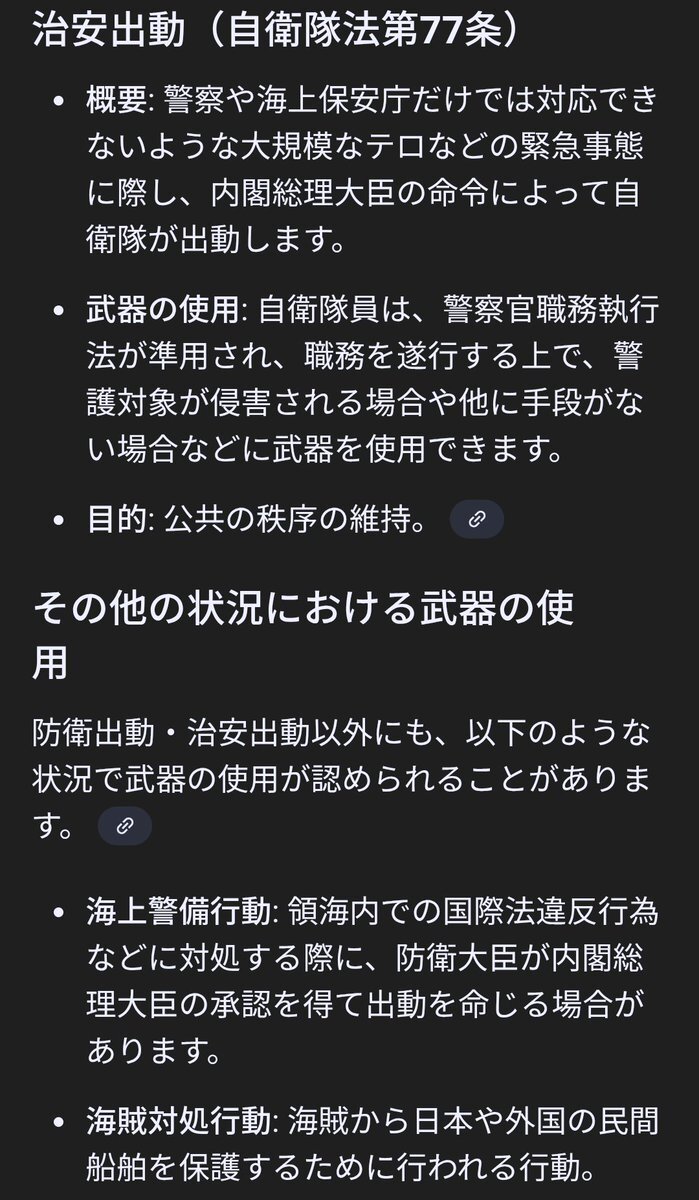 治安出動なのは、さっき書いたけど国会議員達の話だと、銃火器を災害派遣で持って行ってはいけないと云う規則は無いから持ってはいけるが、撃つ時は正当防衛(自己保存)でしかダメだというのが今の国会での認識らしいから。 ただ、災害派遣は知事の要請で行けるが、治安出動は首相じゃないと駄目 x.com/katot1970/stat…