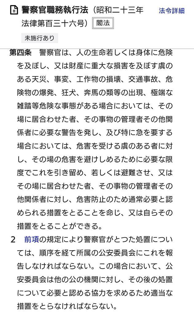 自衛隊法や関連法をよく読んでください。 自衛隊が出動する要件は他の自治体や機関や組織では対応が「難しい」や「限界を超えた」時です。 警察官職務執行法はあくまで警察官に何が出来るかを書いた法です。 警察官では対応できない内容だから自衛隊が出動しています。 x.com/alwaysbase/sta…