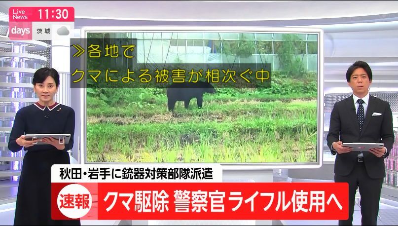 クマ対策で自衛隊に遅れまいと警察庁の楠芳伸警察庁長官は警察官職務執行法を改正しライフル銃など特殊銃が配備される部門の任務を重要施設の警備・ハイジャック対処・凶悪犯罪の鎮圧に限られていたものをクマの駆除にも拡大し今日から機動隊の銃器対策部隊が秋田と岩手県警に派遣され  続く