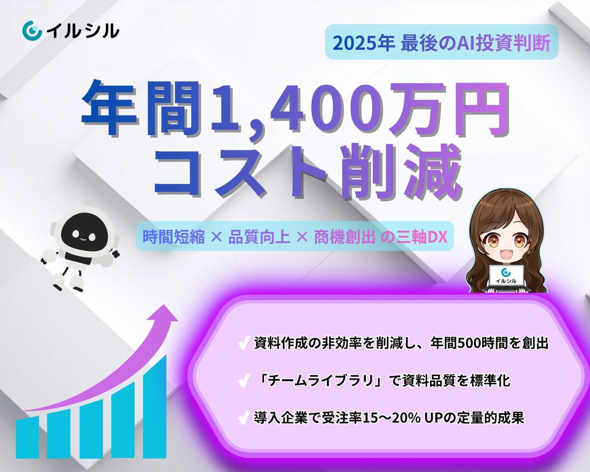 「AI導入で本当に費用対効果(ROI)が出るのか?」 年末の予算策定を控える経営層・DX推進担当者へ。 スライド生成AI「イルシル」の法人プランは、単なる効率化を超え、ROIを最大化するDX投資として注目されています。 ✅ 数値で示せる成果 pic.x.com/LVtVY1Ww5j