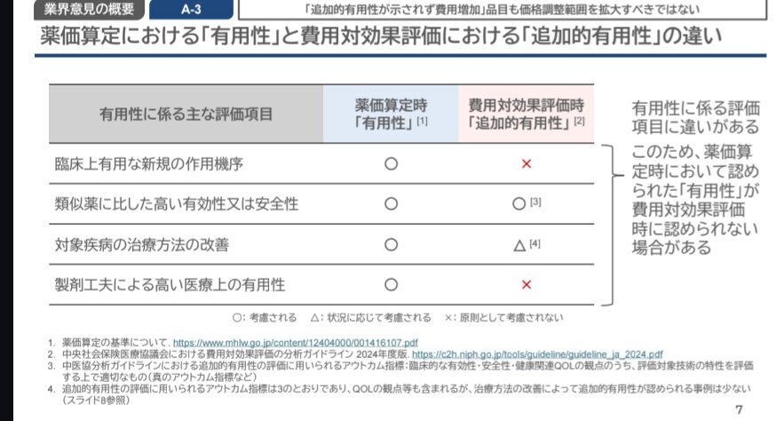 11/12に行われた 費用対効果評価専門部会の 業界からの意見陳述資料みてるんだけど たしかに〜って勉強になる まずはこれ 薬価算定時と費用対効果評価時で評価する有用性の部分が違うの…知らなかった! 作用機序や製剤工夫の有用性は費用対効果評価時に見てもらえず薬価下がるだけ🤮 ズルい🧚 pic.x.com/pb8uZXcwNC
