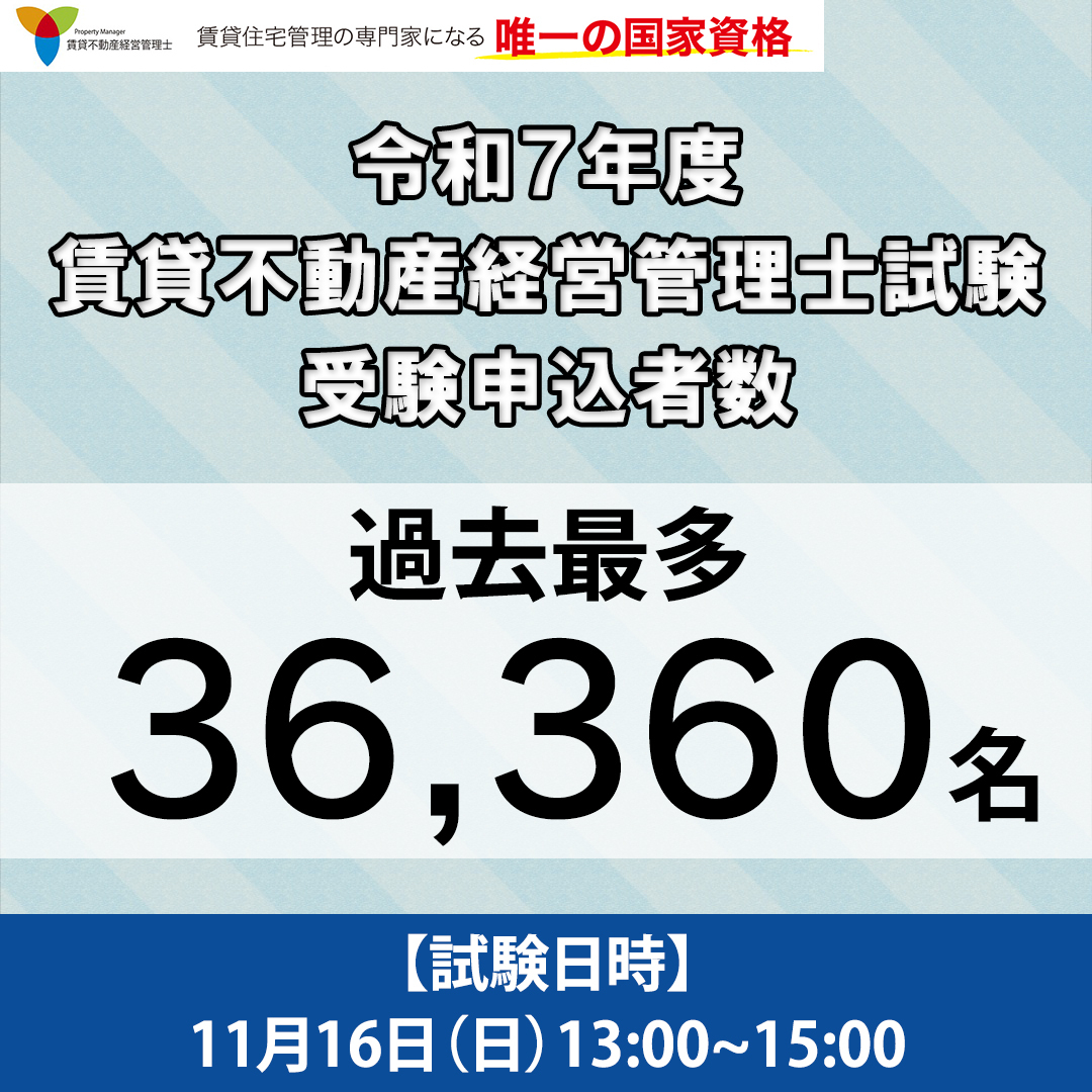 返信先:@iceheart0120おはようございます! 令和7年度賃貸不動産経営管理士試験申込者数は昨年度を807人上回った36360人でした。