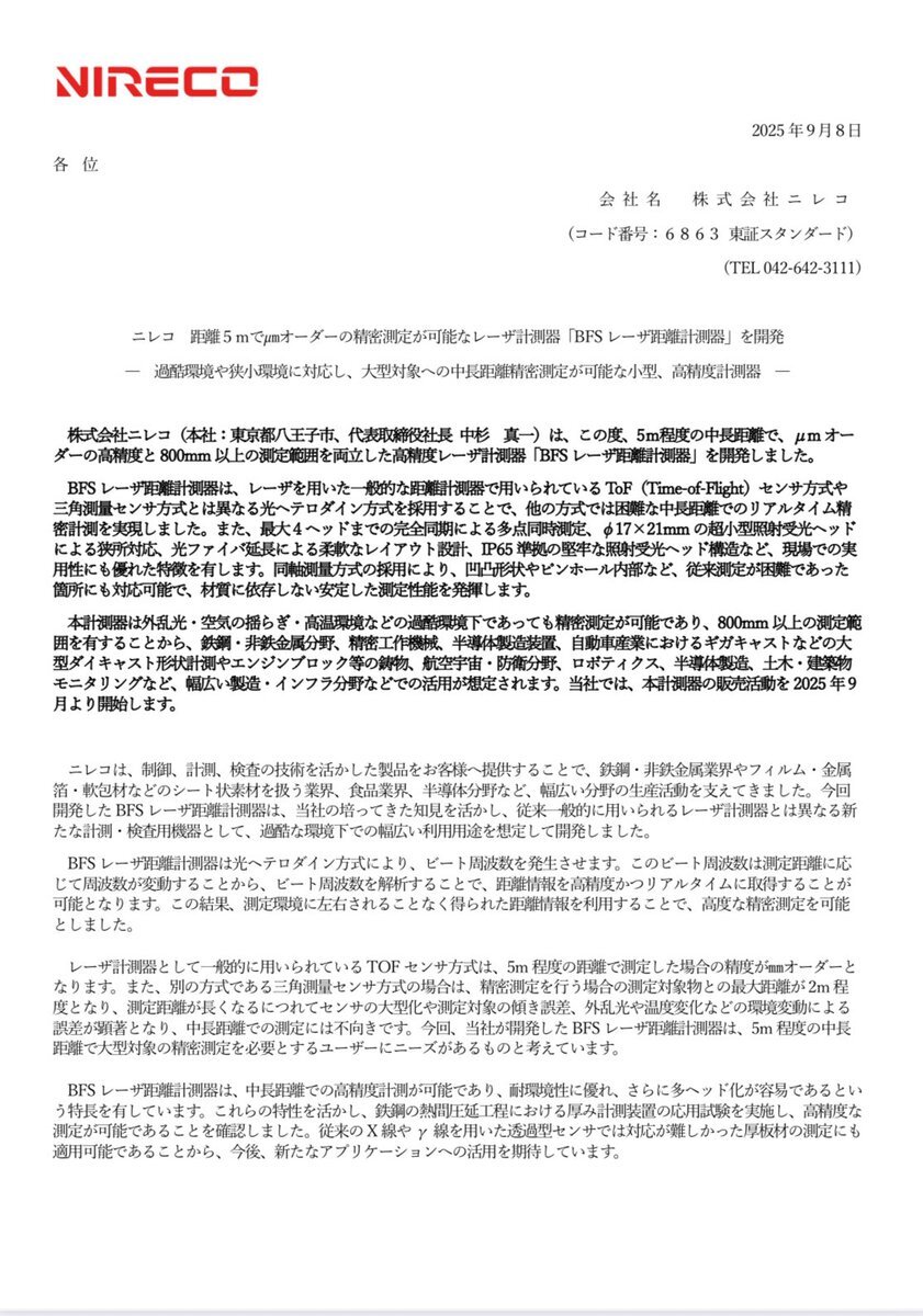 決算後にニレコ買い増し。BFSレーザ距離計測器、マーケット規模はありそうなので、数年後に15〜30億円くらいに育つ事を期待。自動車、半導体製造装置、ギガキャスト、防衛・宇宙関連向けなんでも良いので採用お願いします。 pic.x.com/jhTpgApYY3
