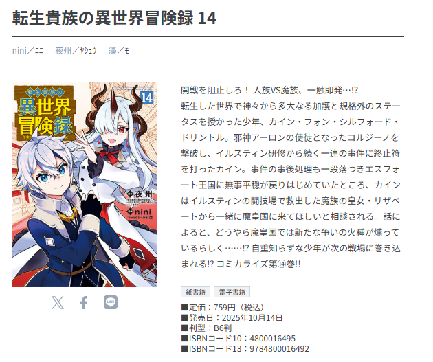 【新刊情報】 2025/10/14/火 発売コミックスのご紹介です! 転生貴族の異世界冒険録⑭ 原作:夜州(「転生貴族の異世界冒険録~自重を知らない神々の使徒~」一二三書房刊) 漫画:nini キャラクター原案:藻) ▼書誌情報 mag-garden.co.jp/comics/14679/ ▼特典情報 mag-garden.co.jp/news/14824/ pic.x.com/Rkn4YLvzhs