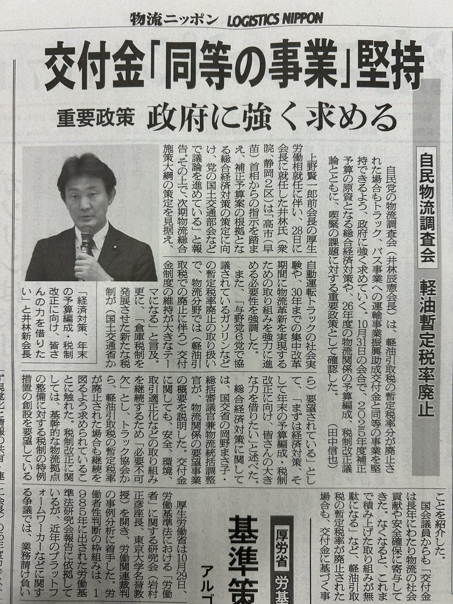 昨日、自民党トラック議連の総会が開かれた。ガソリンの暫定税率は12月末をめどに廃止する方向で、軽油引取税暫定税率も来年4月の廃止を目指して調整中である。また交付金はドライバーの社会的地位向上等に必要なため当面は存続し、新たな仕組みも検討する。持続可能な物流構築は重要な課題だ。
