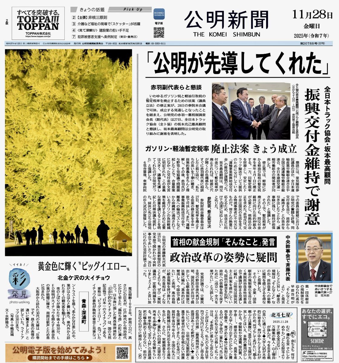 (ガソリン、軽油の暫定税率)合意文書案、公明が了承/きょう与野党6党で正式決定 本日無料 公明新聞 2025年11月5日付 1面 #軽油引取税#ガソリン税#運輸事業振興助成交付金#ガソリン、軽油の暫定税率 digital.komei-shimbun.jp/flag/pickup/02…