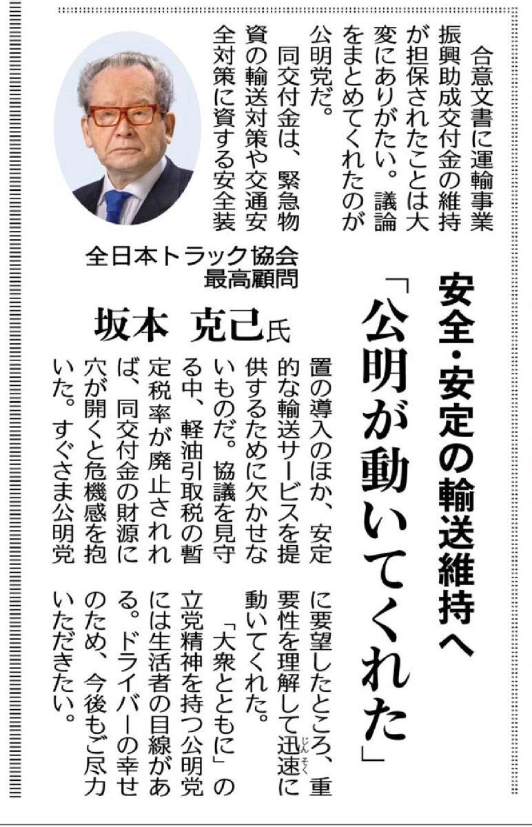 @Makoto_Nakao ガソリン税と軽油引取税暫定税率が廃止される合意文書に、運輸事業振興助成交付金の維持が担保されたことは大変にありがたい。議論をまとめてくれたのが公明党だ。『大衆とともに』の立党精神を持つ公明党には生活者の目線がある」 坂本克己 最高顧問(全日本トラック協会)