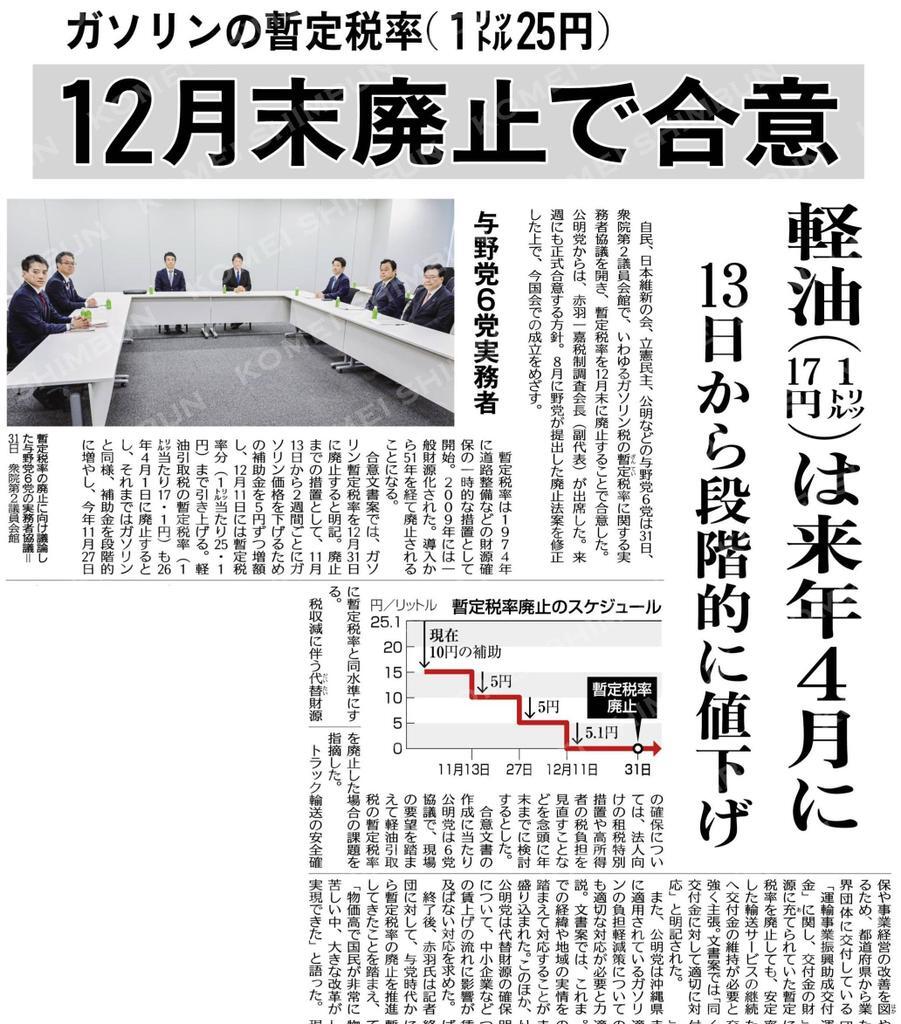 (ガソリンの暫定税率)12月末廃止で与野党合意/公明、運送事業交付金の維持主張/軽油は来年4月に 公明新聞 2025年11月9日付 2面 #軽油引取税#ガソリン税#運輸事業振興助成交付金 digital.komei-shimbun.jp/kmd/article/04…