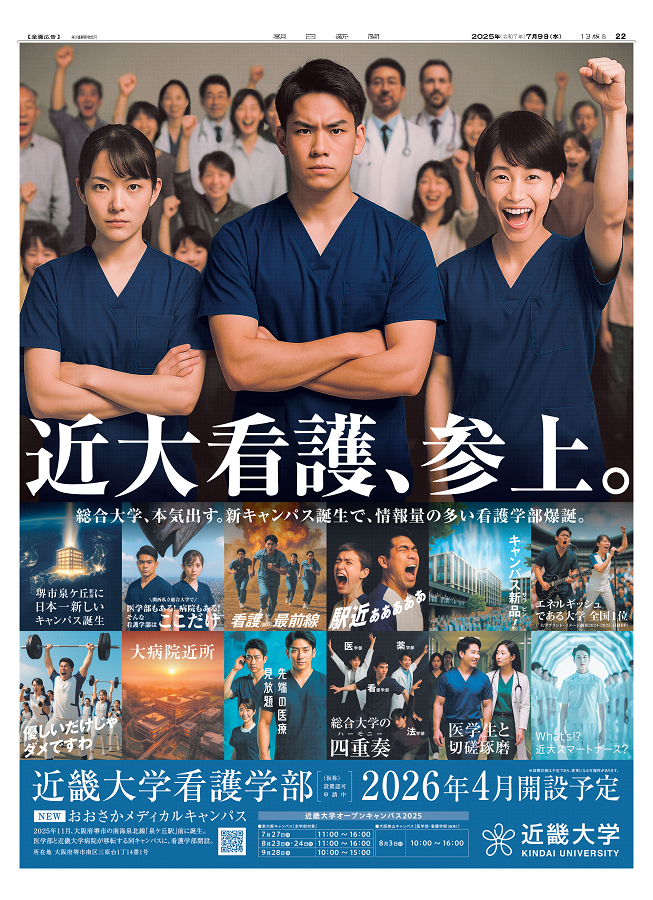 近大看護、参上。 2025年11月に大阪府堺市に #近畿大学 「おおさかメディカルキャンパス」が誕生。 医学部と近畿大学病院が移転する同キャンパスに2026年4月、看護学部を開設予定。※(仮称)設置認可申請中 本日の朝日新聞朝刊(大阪本社版)に広告を掲載しました。看護学部にご期待ください! #新聞広告 pic.x.com/rJr8VJEZTm