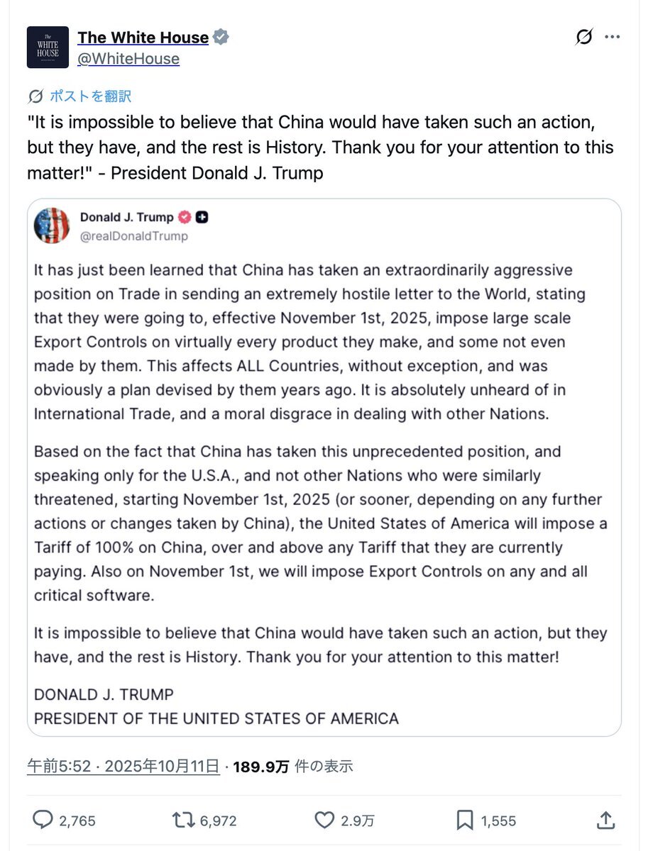 中国が、すべての貿易国に、ほとんどの中国製品と中国製品以外にも大規模な輸出規制をかけると通達した事を受けて、米国も11月1日から対抗して100%の追加関税と重要なソフトウェアに輸出規制をかけると投稿するトランプ大統領:中国がそんな事をするなど信じがたいが、彼らはやってしまった pic.x.com/SgnXVhPwoW