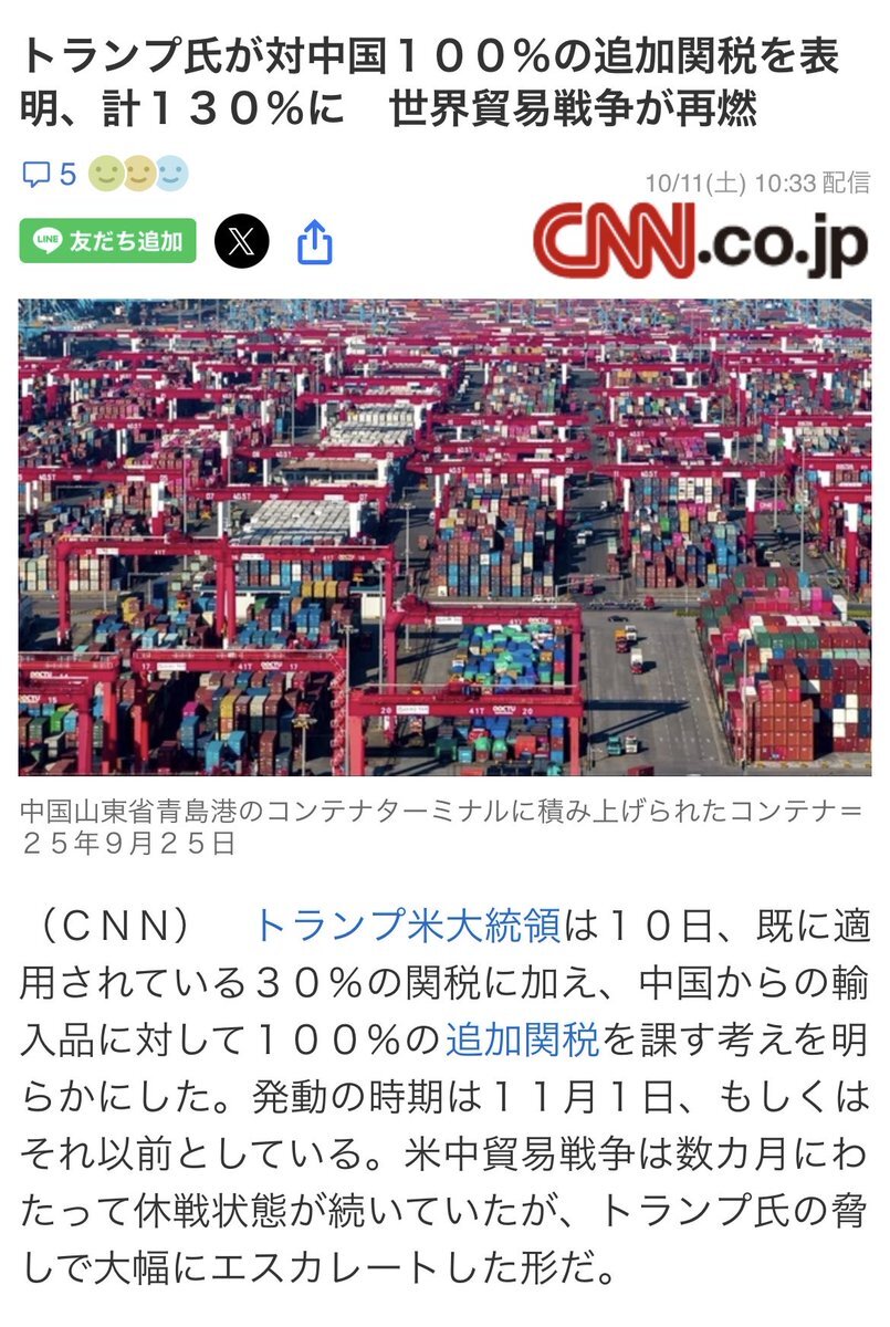 【SNS投稿】トランプ大統領、中国に100%の追加関税を表明 news.livedoor.com/article/detail… 中国がレアアース(希土類)関連の輸出規制を強化する方針を各国に通告しているとして、11月1日から中国からの輸入品に100%の追加関税を課すと表明。米国製の重要ソフトウェアに輸出規制を課すことも明らかにした。 pic.x.com/U7lnIH83iX