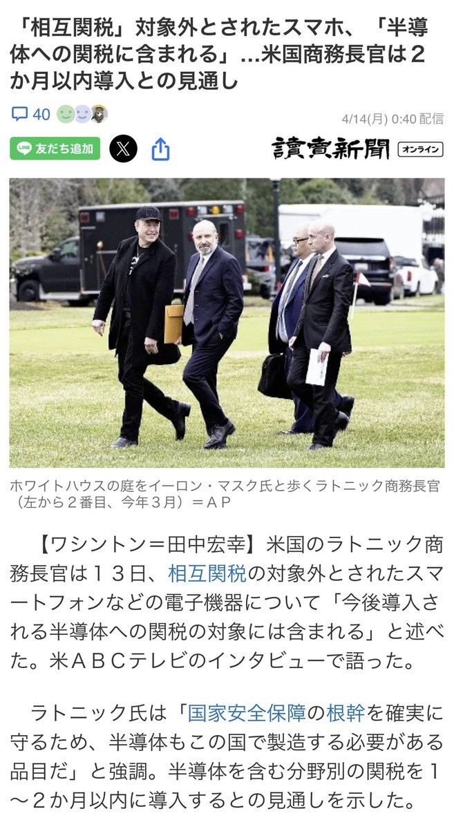 相互関税対象外とされたスマホ 半導体への関税に含まれる 2か月以内導入との見通し 除外は一時的なもの 米半導体大手エヌビディア フアンCEOの化けの皮が剥がれる のも時間の問題か AIバブル崩壊2025年5〜8月 中国とアメリカは分断へ lin.ee/93MbRhb x.com/mayuichi103/st…
