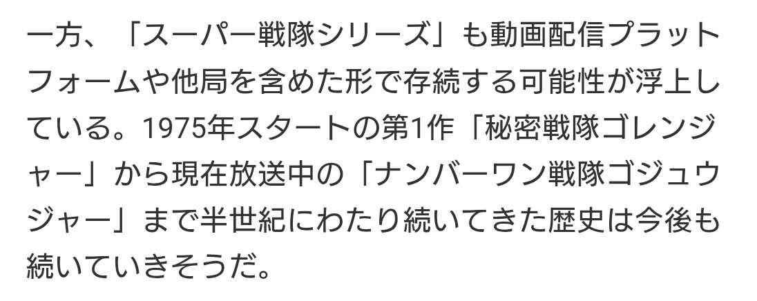 スーパー戦隊もTTFC等で新たな作品が出るかもしれないとのことですが僕としても戦隊がぱったり途切れるとは思っておらず、既存戦隊の新作や別シリーズとのコラボ等で今後も露出はあるのではないかと考えております 好調であればきっと新戦隊も生まれるのではないでしょうか x.com/YahooNewsTopic… pic.x.com/9u1r9lWbyr