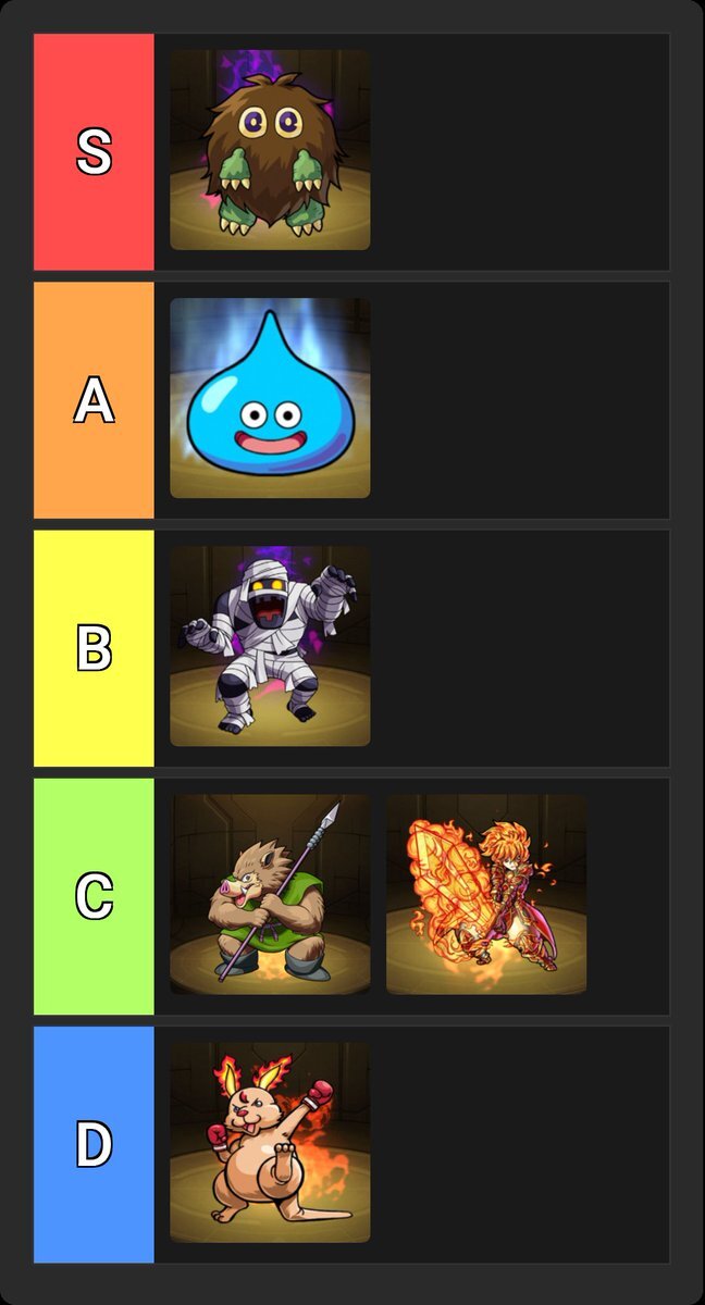 #モンスト 個人的なメダル枠のTier 速度計算とかしない一般プレイヤーだったらこんな感じになりそう スライムはクリボーと同じでいいとも思うんだけど、移動制限ギミックに対応してるのが2つだけで、何よりもゲージがあるから個人的には1つ下がるかも pic.x.com/Lxb9T1Qu8y