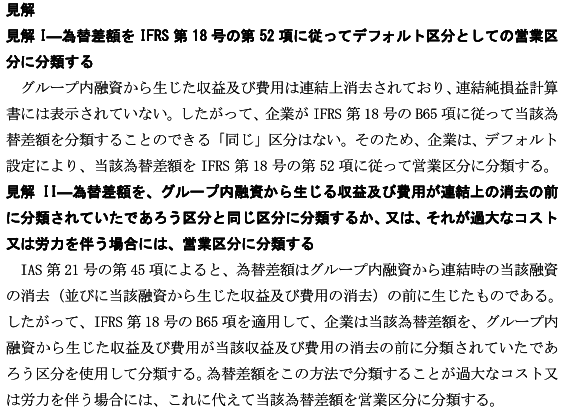本設例のように連結消去される借入金から生じた為替差損益の分類について、IFRS18号で考えた場合、個別ベースでの分類同様に財務区分のままでよいのだろうか。それとも連結ベースでは借入したことにはならないから、財務区分ではなく営業区分に振り替える必要があるのだろうか。 x.com/yuyukaikei/sta…