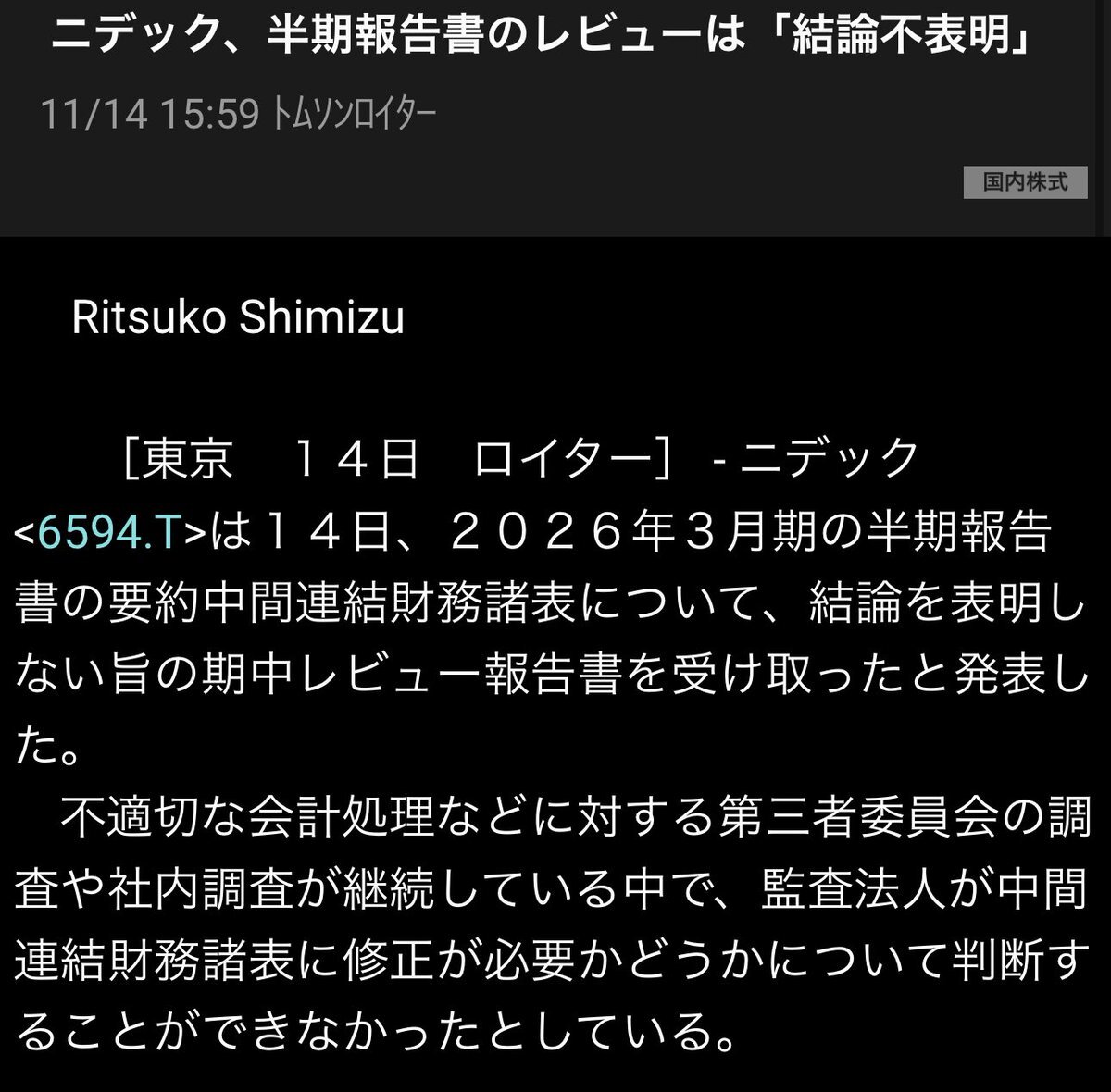 ニデック、4―9月期純利益58%減 半期報告書のレビューは結論不表明 『第三者委員会の調査や社内調査が継続している中で、監査法人が中間連結財務諸表に修正が必要かどうかについて判断することができなかったとしている。26年1月下旬に管理体制の改善計画を発表する』 jp.reuters.com/markets/world-…