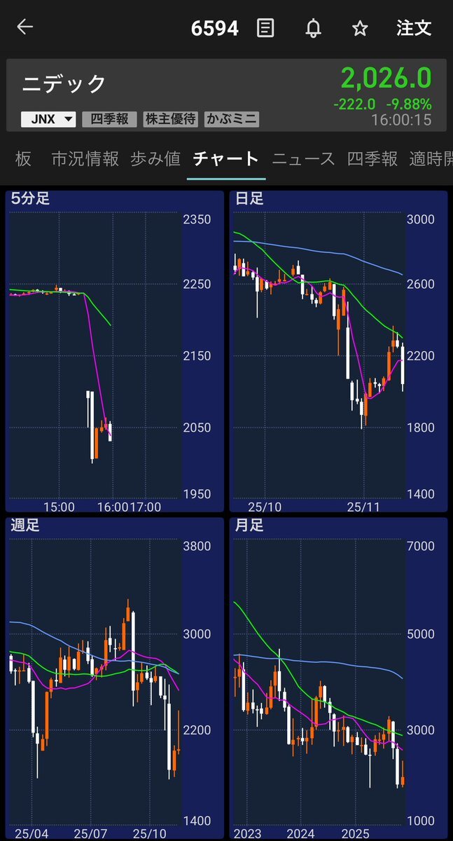 🚨NISA上位銘柄のニデックさん、逝く ・2026年3月期第2四半期決算を発表:営業利益211億円(前年比▲83%減)、純利益▲58.6%減 ・車載事業関連で減損損失や引当金など876億円の損失・債務を計上 ・半期報告書の要約中間連結財務諸表について、結論を表明しない旨の期中レビュー報告書 x.com/yukimamax/stat…