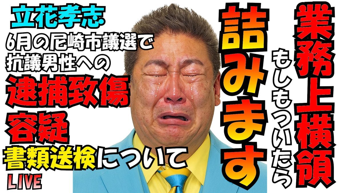 【演説中】立花孝志被告と支援者2人を書類送検、批判する男性へ「逮捕傷害」疑い news.livedoor.com/article/detail… 6月の尼崎市議選で、演説中の立花被告を批判する配信をしていた男性に対し立花被告が「妨害やな、よし、あいつを逮捕する」と発言。支援者2人が男性を拘束し、頸椎捻挫のけがをさせた疑い。