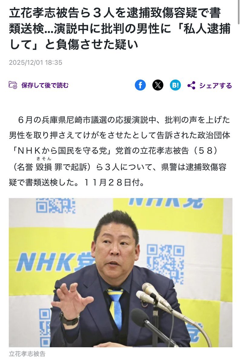 立花孝志被告ら3人を #逮捕致傷容疑 で書類送検…演説中に批判の男性に「私人逮捕して」と負傷させた疑い : 読売新聞オンライン yomiuri.co.jp/national/20251…