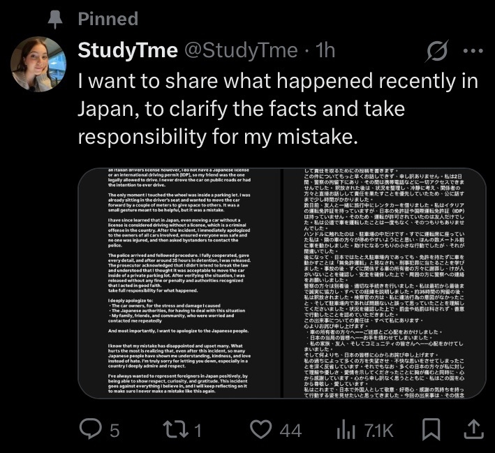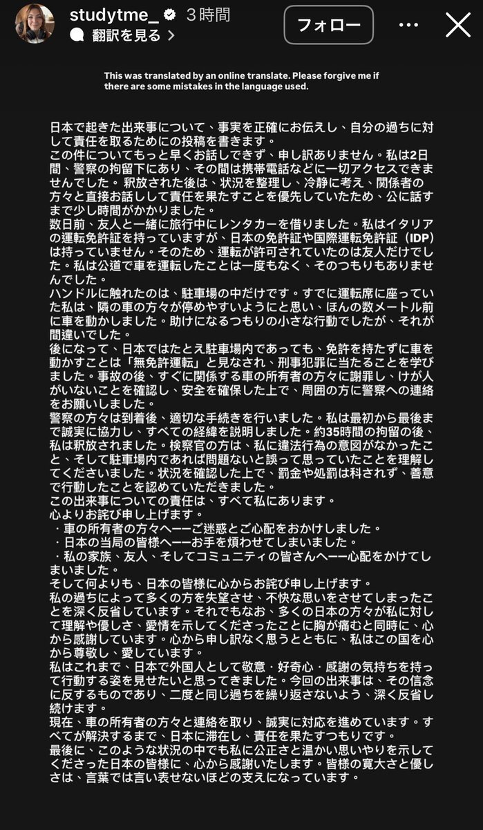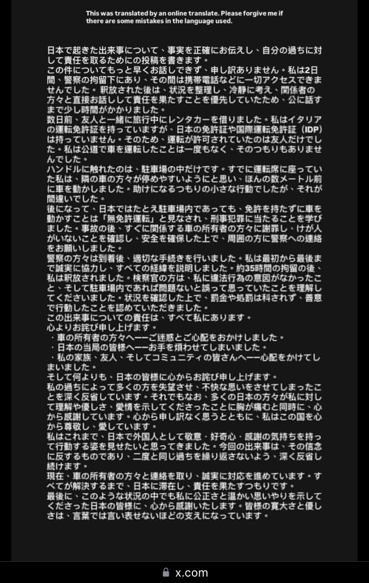 [まさかの不起訴] 海ほたるで起きた無免許衝突事故の続報 なんとZumiだけでなく加害者のイタリア人Studytmeも起訴されずに釈放されたとのこと 先程インスタに謝罪文が掲載され 「約35時間の勾留の後状況を確認したうえで、罰金や処分は課されず善意で行動していたことが認められた」 は??? pic.x.com/Q0JH5fzOHd x.com/canceljohnnys/…