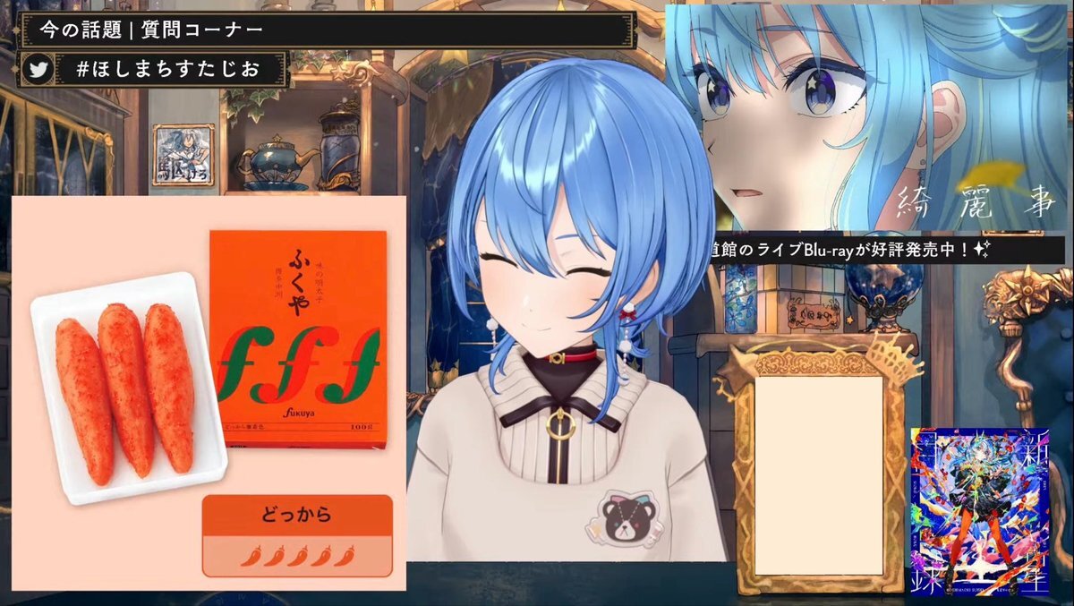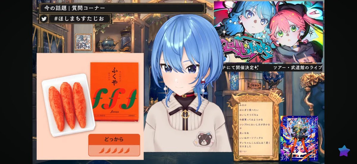 雑談おつまち! 話題てんこ盛りで楽しかった〜!重大歯表あったけど虫歯じゃなくて良かったね😊 AZKiちゃんのライブの裏話とかみこちの生ハムの話もしれて面白かった! あとふくやの明太子とコラボおめでとう!辛いの苦手だけど食べれそうなのあったら食べてみたい😋 #ほしまちすたじお pic.x.com/B1xqbxmgRa