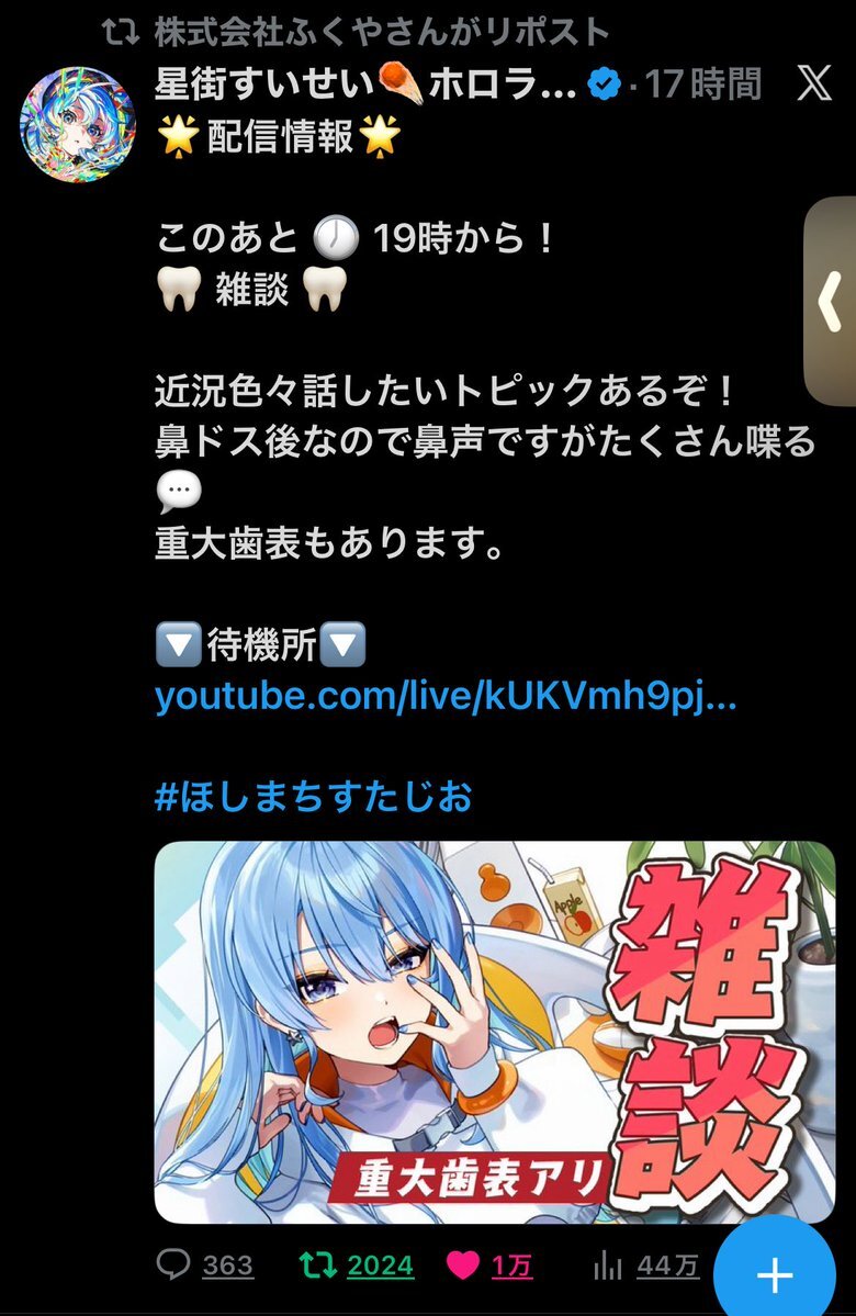 🌟配信情報🌟 このあと 🕖 19時から! 🦷 雑談 🦷 近況色々話したいトピックあるぞ! 鼻ドス後なので鼻声ですがたくさん喋る💬 重大歯表もあります。 🔽待機所🔽 youtube.com/live/kUKVmh9pj… #ほしまちすたじお