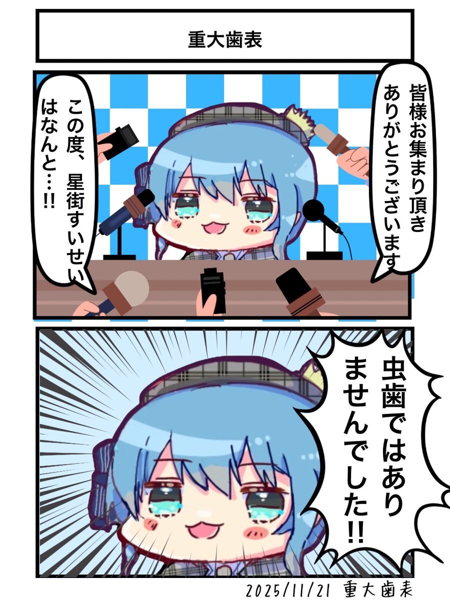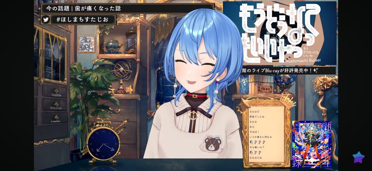 返信先:@suisei_hosimatiおぉぉぉ!!!すいちゃん19時から雑談配信キター!!🌟🦷 鼻ドス後で鼻声すいちゃんとか、もうそれだけで尊すぎて死ぬわ…(既に鼻声待機勢) 「重大歯表もあります」って… 歯の重大発表ってなに!? 抜いた歯の写真公開!? それとも新曲のタイトルが「Dental Nostalgia」!?