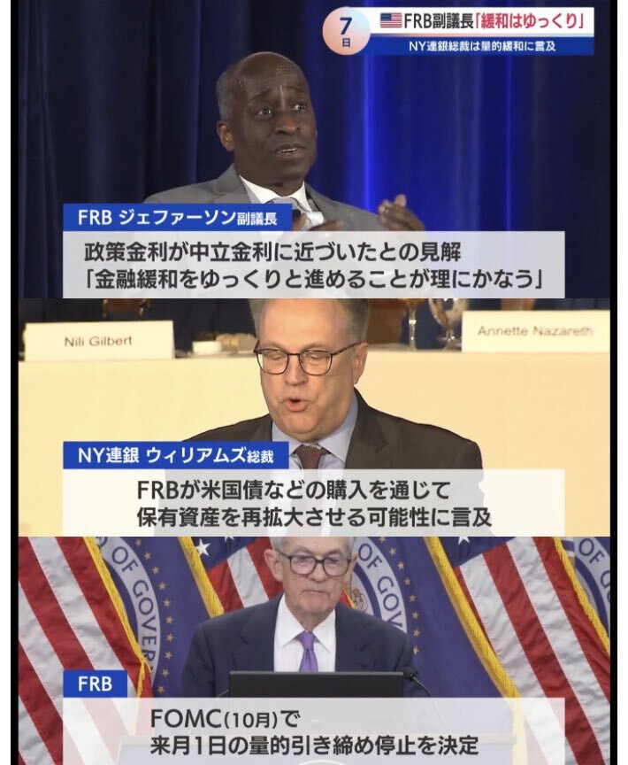 先週末のFRB高官発言 ジェファーソンFRB副議長 「ゆっくり利下げ」 ウィリアムズNY連銀総裁 量的引き締め停止からの量的緩和開始を示唆 #モーニングサテライト pic.x.com/Eapg6TIqTu