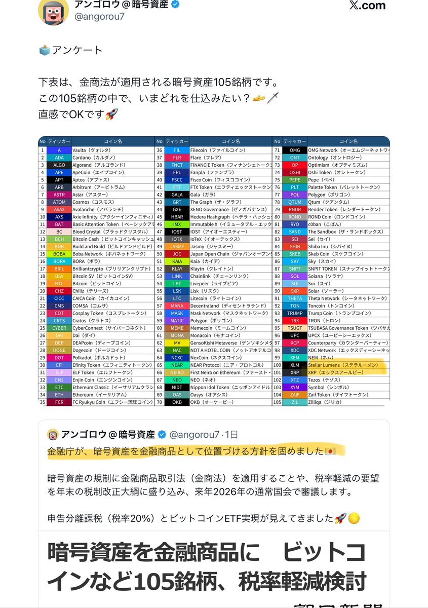 📢【速報】国内暗号資産105銘柄が“金商法”の規制対象に → 金融庁が、暗号資産を「金融商品取引法」の枠組みに含める方針を固める → 対象銘柄は国内交換業者取扱いの約105銘柄。発行体・技術・価格変動リスクの開示義務&インサイダー規制の適用へ → 改正法案は2026年通常国会提出を目指す方向。