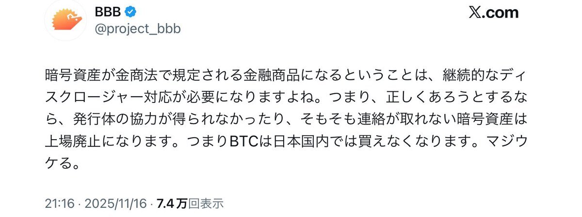 ビットコインなど105銘柄に金商法を適用する方針ってニュース、 正直“インサイダー的な感じ”だった部分にメスが入るので個人にはほぼメリット。 ・インサイダー/風説が規制されて健全化 ・主要銘柄(BTC/ETH/SOLなど)だけ触ってる人は影響ほぼなし x.com/yahoonewstopic…