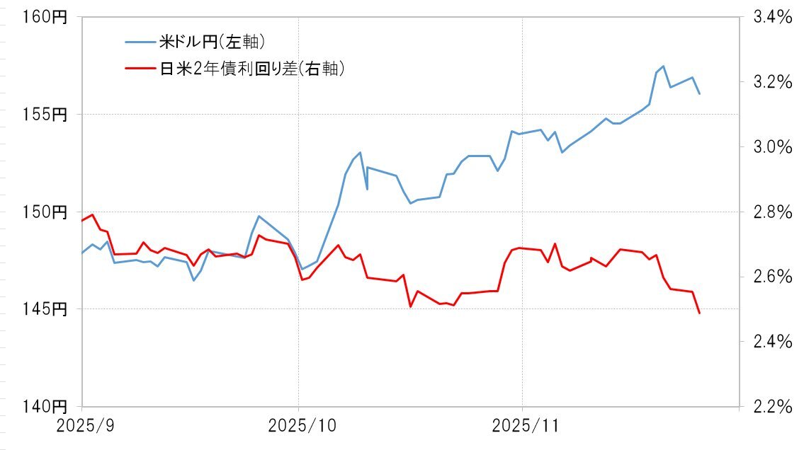 今週は日本の長期金利上昇(債券価格下落)でも円高(左図)。米12月利下げ予測再燃に伴う日米金利差縮小に反応している(右図)。 pic.x.com/iOeSpapNy0