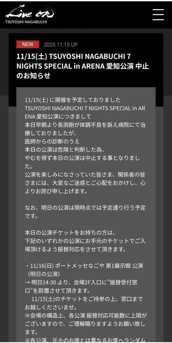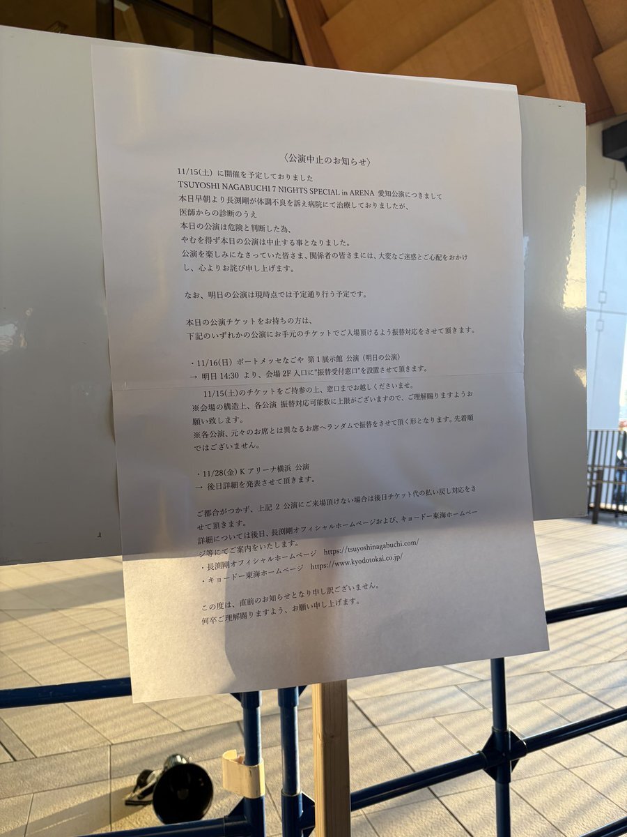 長渕剛、ライブ中止に!! 本日のポートメッセ名古屋の ライブが体調不良で中止に。 あらら、返金対応か? 明日のライブの空いてる席に振替 だって、、 超良席の方、、かわいそう。 暫く休んでゆっくりした方が? u.lin.ee/9rMqae4?mediad… #長渕剛 #ライブ中止 #ポートメッセ #なごや pic.x.com/b699RqyTvZ