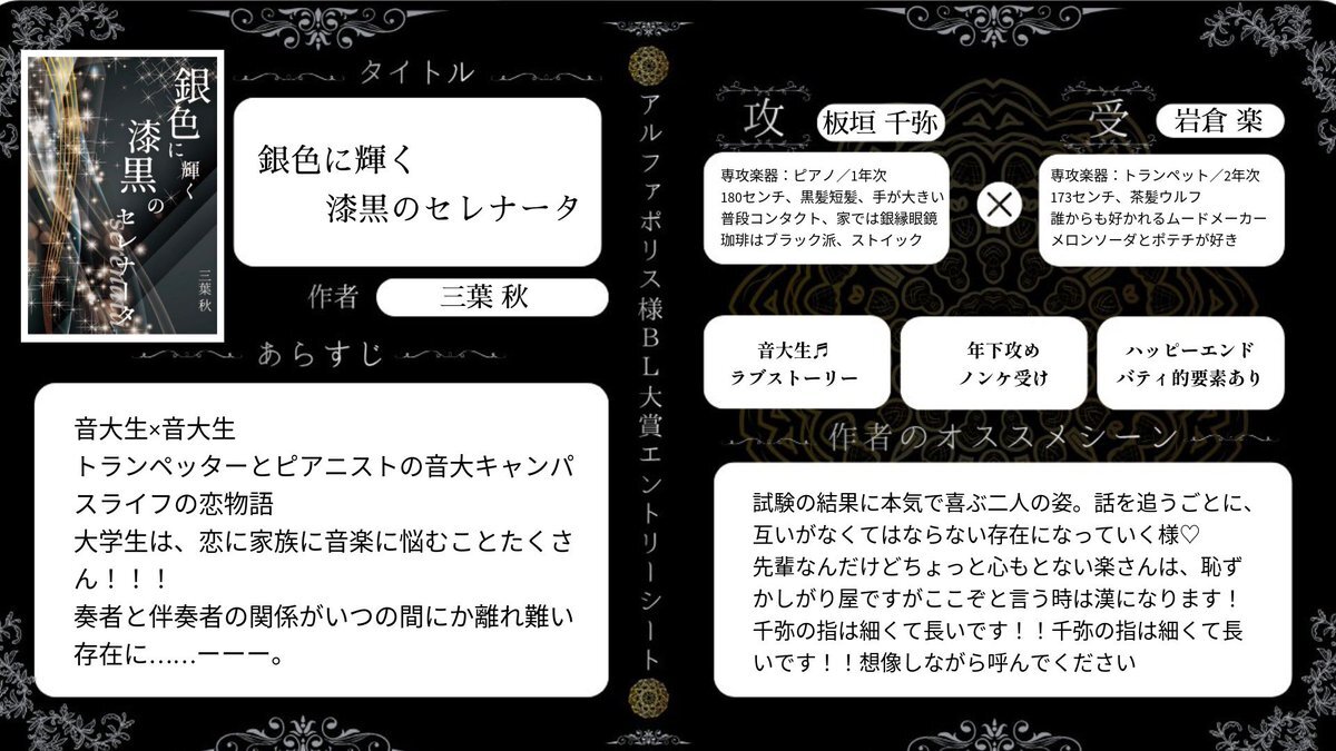 つきよの様(@tukiyono_bokuno)のテンプレートをお借りしました(* ᴗ͈ˬᴗ͈)” 「銀色に輝く漆黒のセレナータ」 音大生🎹×音大生🎺 番外編更新中•*¨*•.¸¸♬︎ よろしくお願いいたします! #オリジナルBL小説 【中長編BL┊︎本編完結】 #アルファポリス alphapolis.co.jp/novel/70853649… pic.x.com/1uYhv93IMh