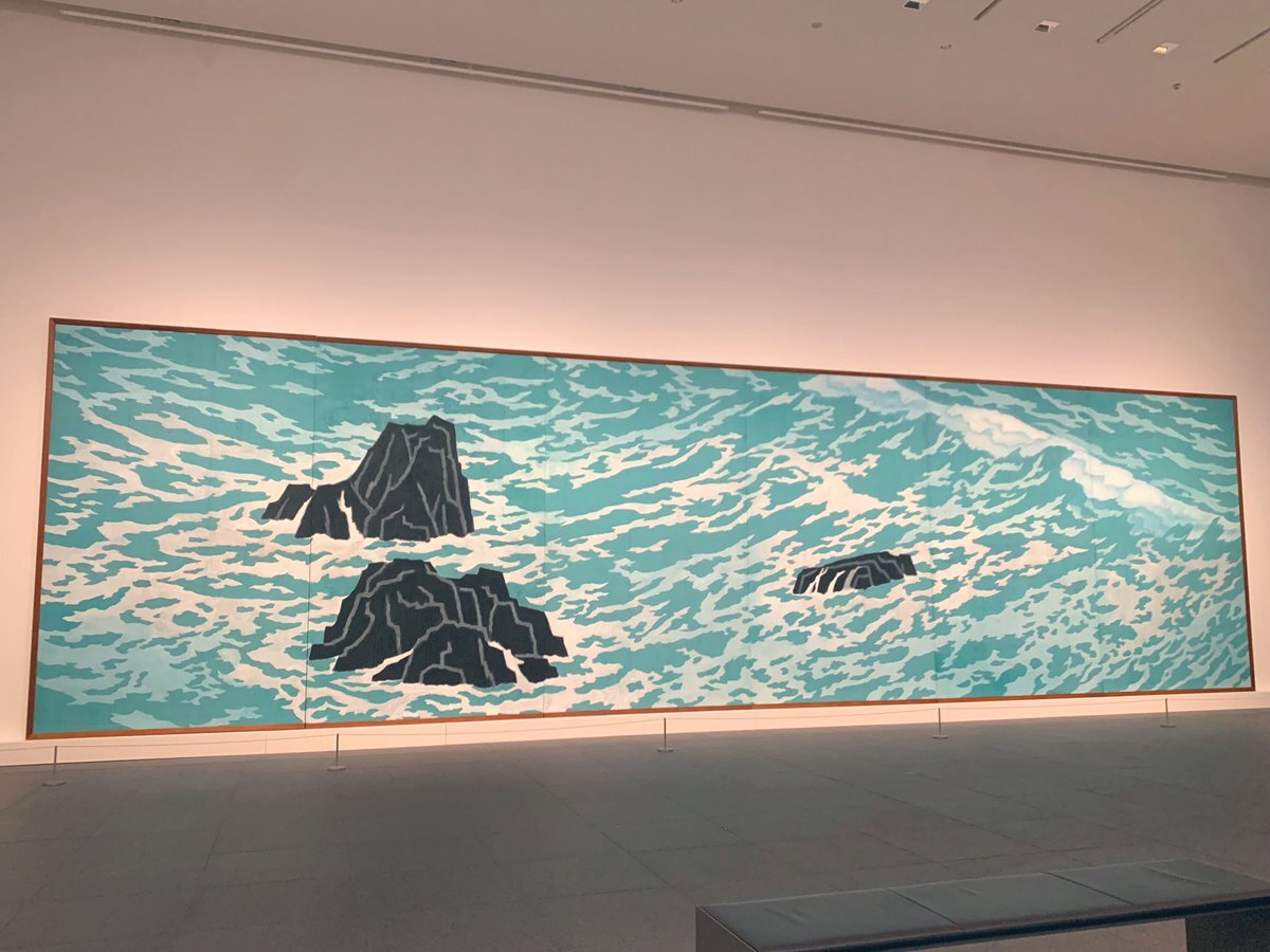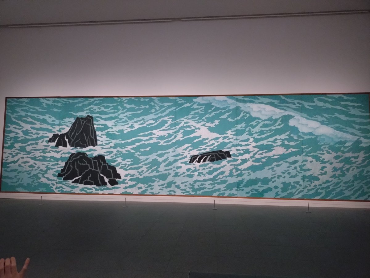 長野県立美術館にて開催している東山魁夷館開館35周年記念展行ってきました。 皇居宮殿壁画《朝明けの潮》の原寸大下図、大きさが縦約4m、横約15mの作品です! 絵の事は全く分かりませんが圧倒されました pic.x.com/A6pzba6wAE
