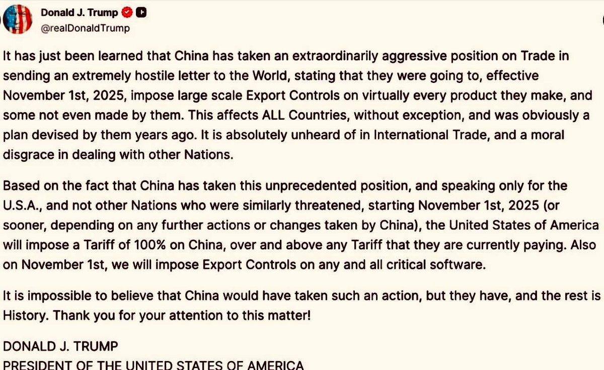 🟧トランプ氏は中国からの輸入品に対し、現在中国が支払っているいかなる関税をも上回る100%の輸出関税を課すと発表しました。 🟧彼によると、関税引き上げと重要なソフトウェアの輸出管理は11月1日またはそれ以前に、中国のさらなる行動や変更に応じて実施される予定です。 🖋彼はSNS「Truth pic.x.com/RFyYAcNwoz