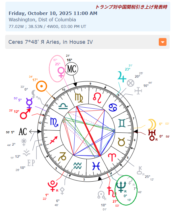 現地時間2025年10月10日午前11時頃、トランプ大統領は対中国の関税引き上げをSNSに投稿。それが要因となって暗号通貨が暴落した。 トランプ大統領が投稿した日時で作ったホロスコープには、2021年の急落の時とおなじく金星♀と海王星(♆)のハードアスペクトが見られる。 pic.x.com/TOY4YjChw7
