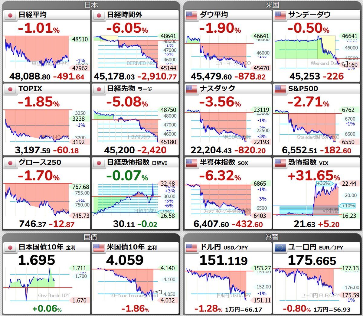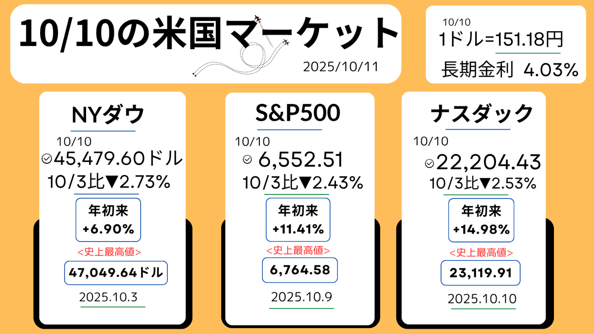【米国市況】10月10日(金) 📉 株式: S&P500は2.7%安、ナスダック100は3.5%安。 トランプ氏の対中関税引き上げ発言でリスク回避が急拡大。VIX指数は22に上昇。 💴 為替: 円は急伸し一時151円17銭。ドル売り・円買いが加速。 自公連立解消で日本の政局不透明感も意識される。 💹 国債: pic.x.com/32aWZtRVaq