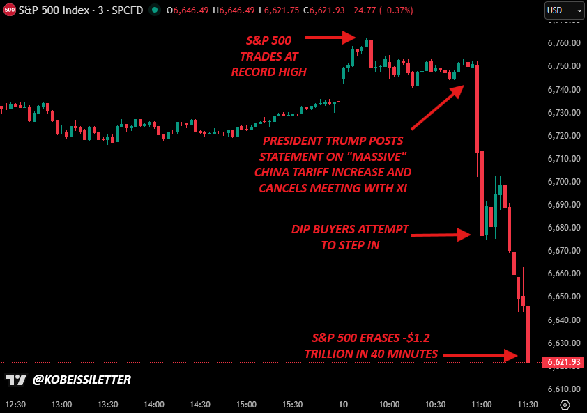 What just happened? At 10:57 AM ET, President Trump canceled his meeting with China and said "massive" tariff increases are coming. 40 minutes later, the S&P 500 erased -$1.2 TRILLION of market cap. Is this dip a BUYING opportunity? Let us explain. (a thread)