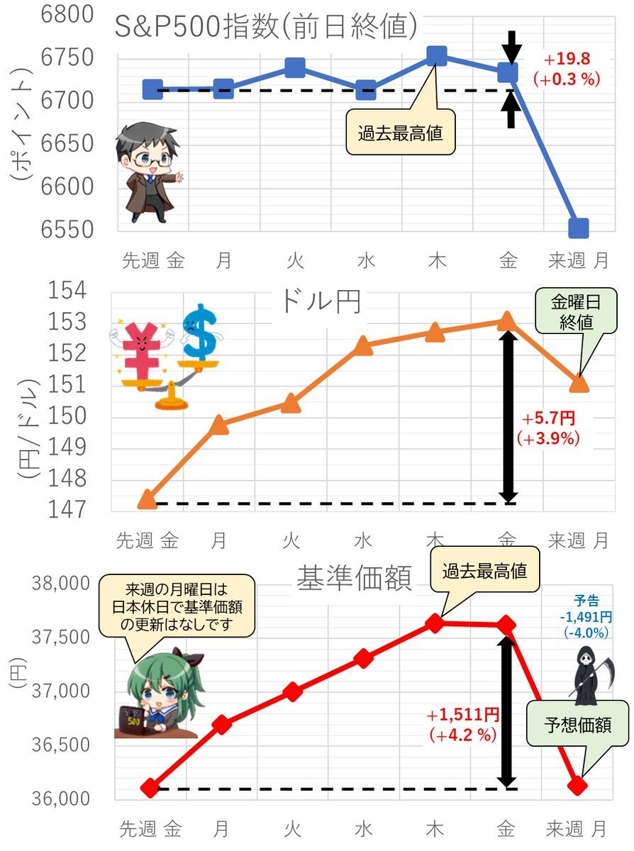 今週のeMAXIS Slim米国株式(S&P500)振り返り。今週のS&P500は堅調で過去最高値を更新するも、金曜日にトランプ大統領が中国に対する大幅関税引き上げに言及し急落。為替は高市新総理の緩和政策の期待から円安に。S&P500高&円安で今週の基準価額は大幅上昇だったが昨晩のトランプ氏の発言で帳消しに pic.x.com/WkStWlKh3D