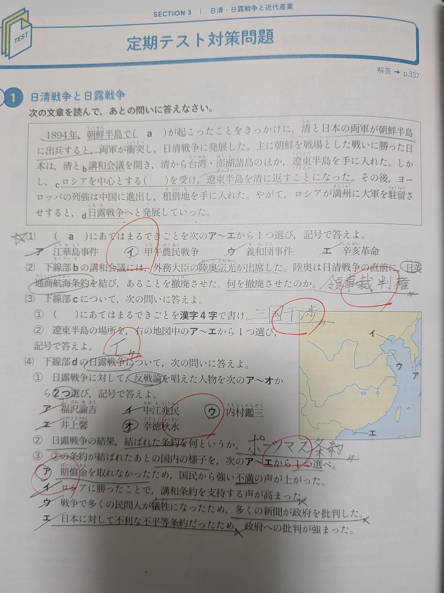 第4章も\(^o^)/オワタ 近現代は関係がめんどくさくなりがちかな。遼東半島と山東半島の場所を引っ掛けてくるのはド定番ですね。懐かしいw。 あとは領事裁判権、法権の回復が先、その後、関税自主権、税権の一部回復、完全回復が後って感じかな。 大体、間違いやすい部分はその辺ですね。 pic.x.com/69b31sSwJc