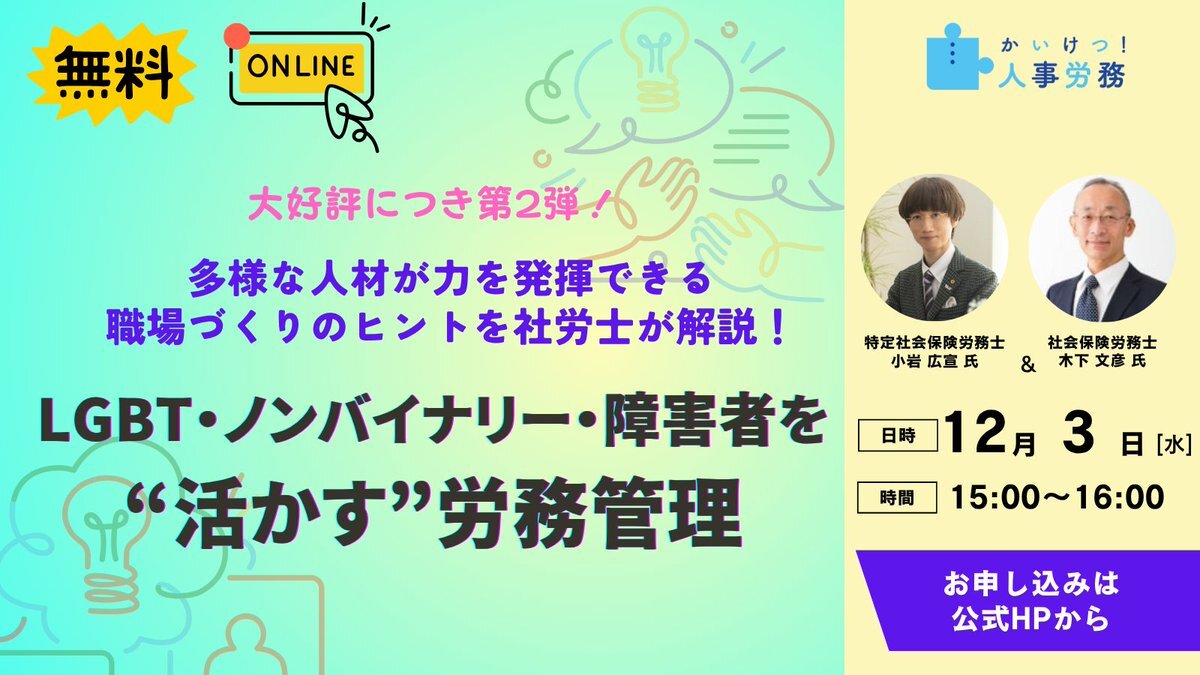 【参加無料】12/3(水)15時~オンライン!LGBT・障害者を“活かす”労務管理セミナー✨ 自社の人材定着・エンゲージメント向上、障害者雇用の推進など、多様な課題を解決!正社員に依存しない柔軟な採用戦略やインクルーシブな組織づくりのヒントが得られます💡 ▼詳細 kaiketsu-j.com/seminar_detail… x.com/koiwahironori/…
