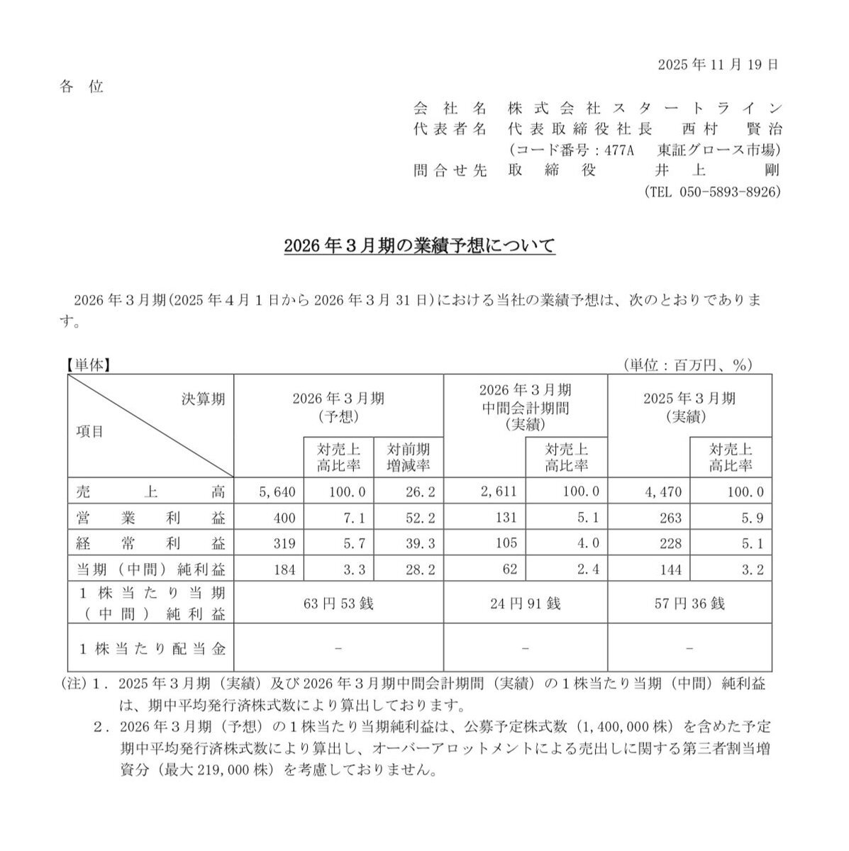 スタートライン、東証グロース上場承認(12/22上場予定) disclosure2.edinet-fsa.go.jp/WZEK0040.aspx?… ・障害者雇用支援サービス ・想定時価総額17億円 ・25/3(16期) 売上高44億円(YoY+23%)、経常利益2億円(+87%) →みずほリースが売上の14.4% ・株主:ディーエムソリューションズ 1.8%(7位)、みずほリース
