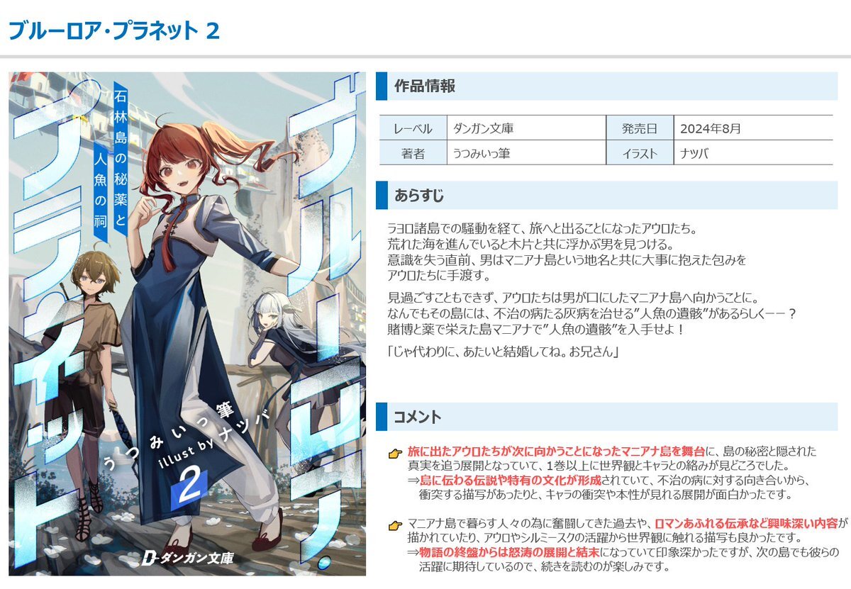 『ブルーロア・プラネット 2』 読みました。 次に向かうことになったマニアナ島を舞台に、隠された真実と島の伝承を追うロマンのある展開が見どころでした。 アウロやシルミースクの活躍も光り、文化や人々の想いが丁寧に描かれていて面白かったです。 #MoriTomo感想 #読了 pic.x.com/1j5UkSg84E x.com/mayor_mori/sta…