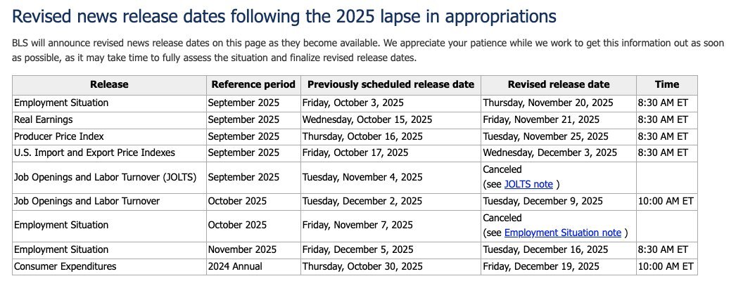 The BLS shared its revised schedule for the rest of the year: ❌ October's jobs report is canceled ⏩ November's jobs report is delayed to Tuesday, Dec. 16