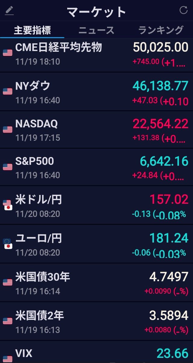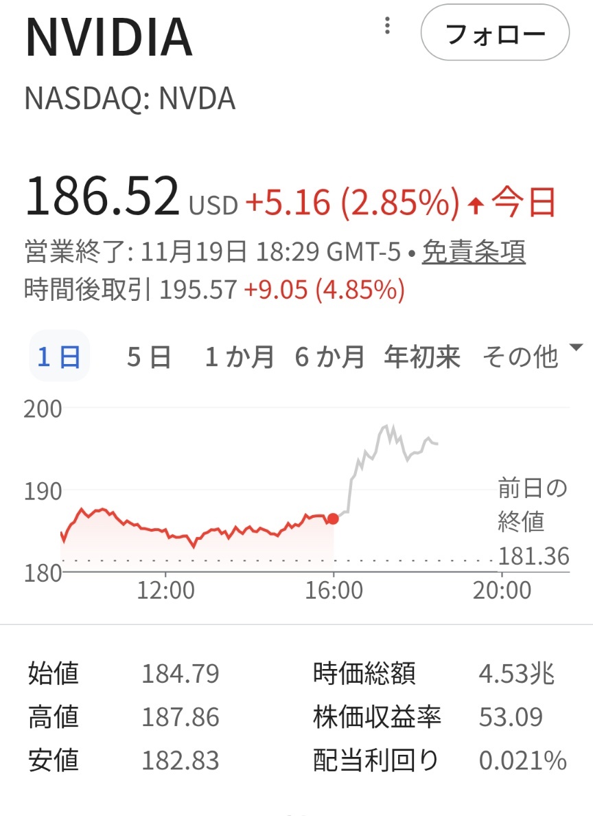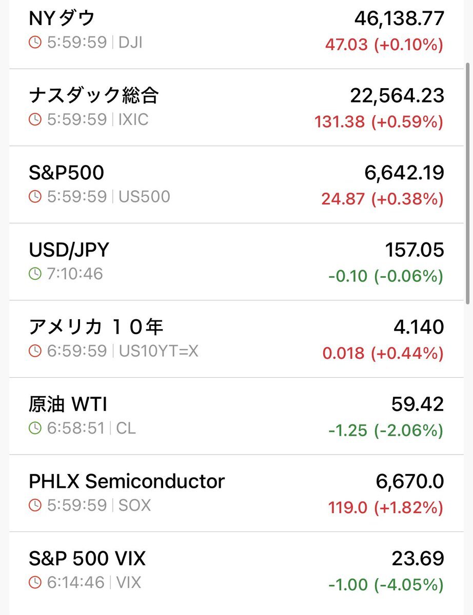 返信先:@Market_Letter_NVDA決算後時間外+3.61%、S&P500とナスダックも小幅上昇。ドル円157円台、円安進行中。米雇用統計発表中止、FOMC議事録で12月利下げの予想後退、今後の市場に注目