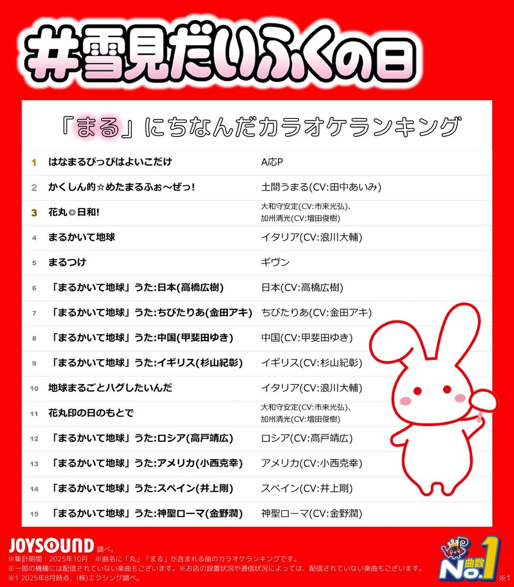今日は #雪見だいふくの日 #雪見だいふく のまぁるいかたちには 食べた人のココロがまぁるくなりますように・・・ という想いが込められているそうです🤍 そこで「まる」にちなんだカラオケランキングを発表⚪️ みなさんが歌いたい曲をリプでおしえてね🎤 x.com/77057066976752…