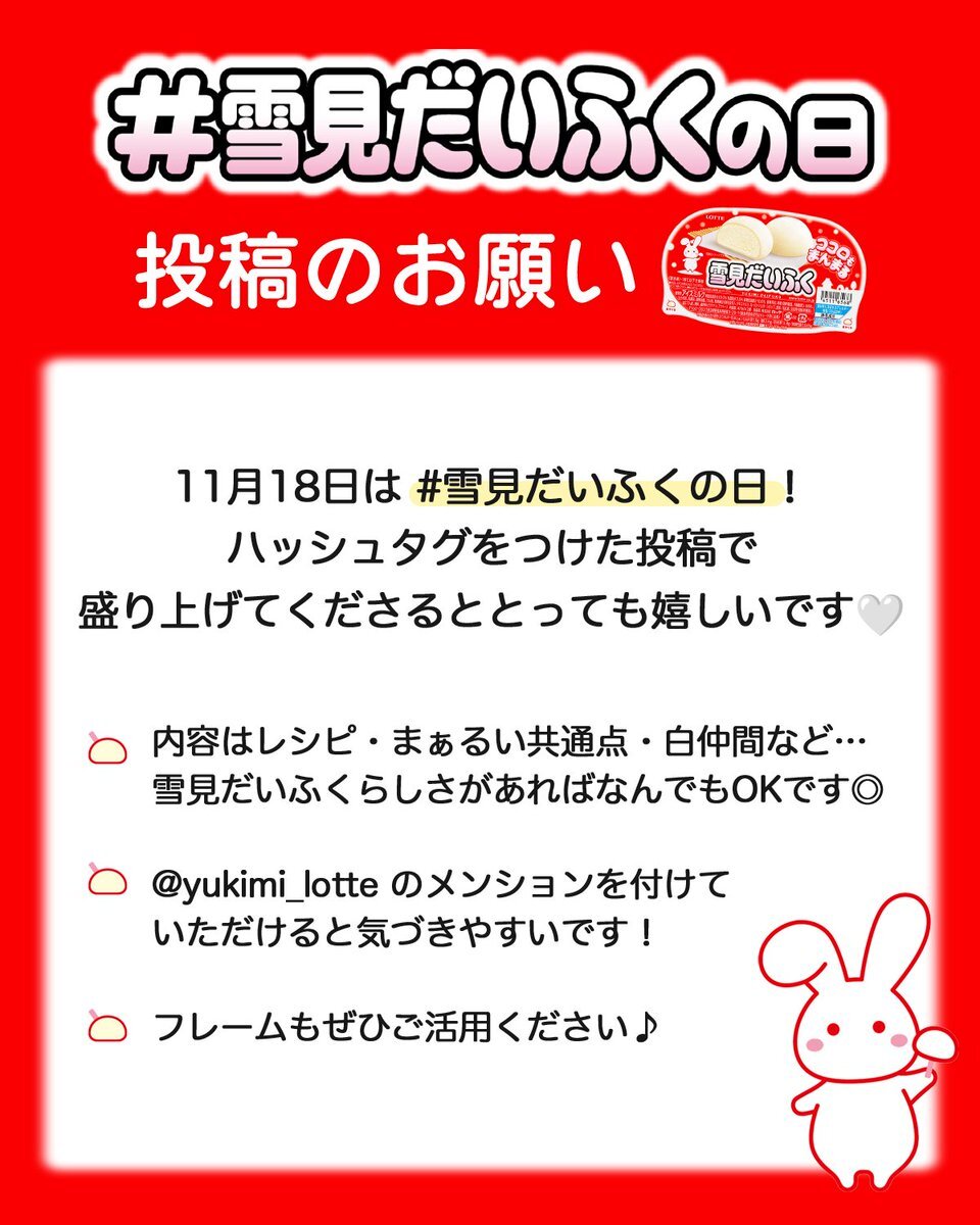 #雪見だいふく からのお願い⚪️ ︶∨︶︶︶︶︶︶︶︶︶︶︶︶︶ 11月18日は『 #雪見だいふくの日 』 企業アカウント様やフォロワー様にお願いです🐰 ハッシュタグを付けた投稿で、年に一度のこの日を一緒に盛り上げてくださると嬉しいです🥹 雪見だいふくの日のフレームもぜひ使ってみてください🤍