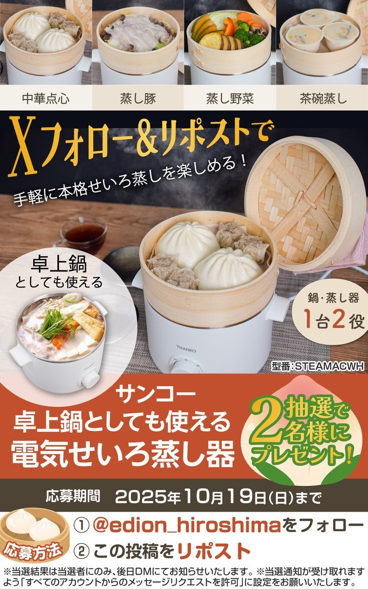 🍲フォロー&リポストで当たる🎁 手軽に本格せいろ蒸しが楽しめる😋 サンコー 「卓上鍋としても使える電気せいろ蒸し器 (STEAMACWH) 」を 抽選で🎯2名様にプレゼント🎉 📌応募方法 1⃣ @edion_hiroshima をフォロー 2⃣ この投稿をリポスト🔁 ⏰応募期間:2025年10月19日(日)まで🌟 pic.x.com/17ZcCzNAXj