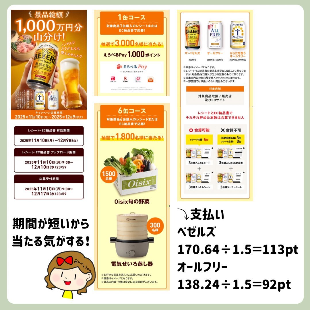 11/14 ローソンお試し引換券おまけ🌟 引き換えで応募できそうです 🟡The BEZERS 1缶 🎁えらべるPay1,000pt 3,000名 6缶 🎁Oisix旬の野菜 1,500名 🎁電気せいろ蒸し器 300名 ✍️レシート応募 suntory.co.jp/non-al/cpn/yam… pic.x.com/3j1zFyoGXl